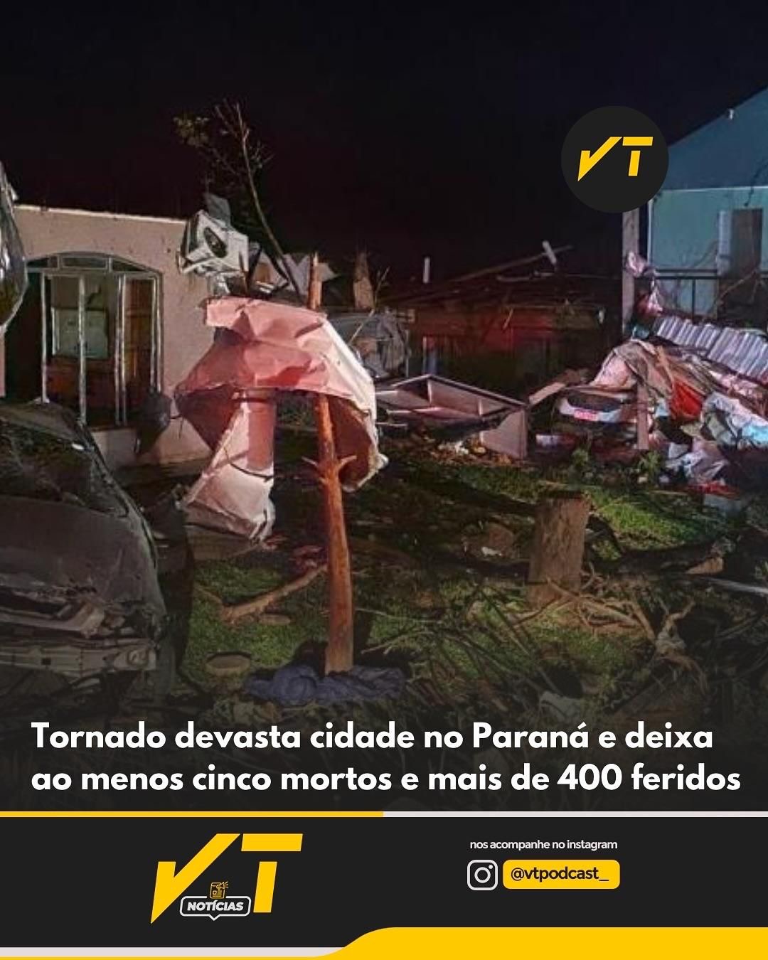 VT Notícias: Um tornado de grandes proporções atingiu o município de Rio Bonito do Iguaçu, no interior do Paraná, na tarde da última sexta-feira (7), deixando um cenário de destruição e comoção. A força do vento arrancou telhados, derrubou casas inteiras em escombros. Segundo a Defesa Civil, cinco pessoas perderam a vida e mais de 400 ficaram feridas, muitas delas em estado grave. Duas pessoas ainda estão desaparecidas.