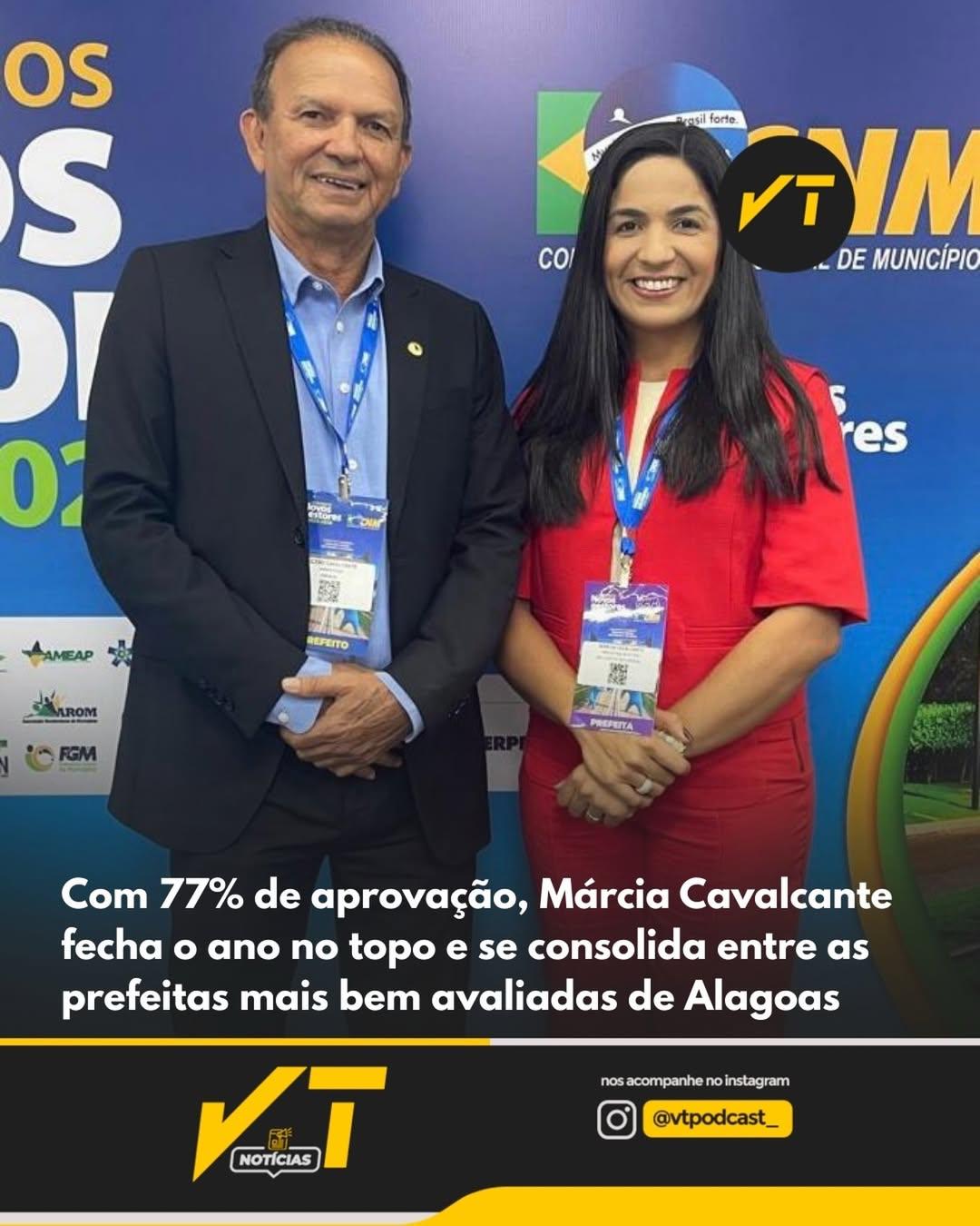 VT Notícias: A prefeita de São Luís do Quitunde, Márcia Cavalcante, encerra o ano com índices expressivos de aprovação popular e se destaca como uma das gestoras municipais mais bem avaliadas do estado de Alagoas em seu primeiro ano de gestão. É o que revela pesquisa realizada pelo Instituto Ápice, no dia 1º de dezembro de 2025.
