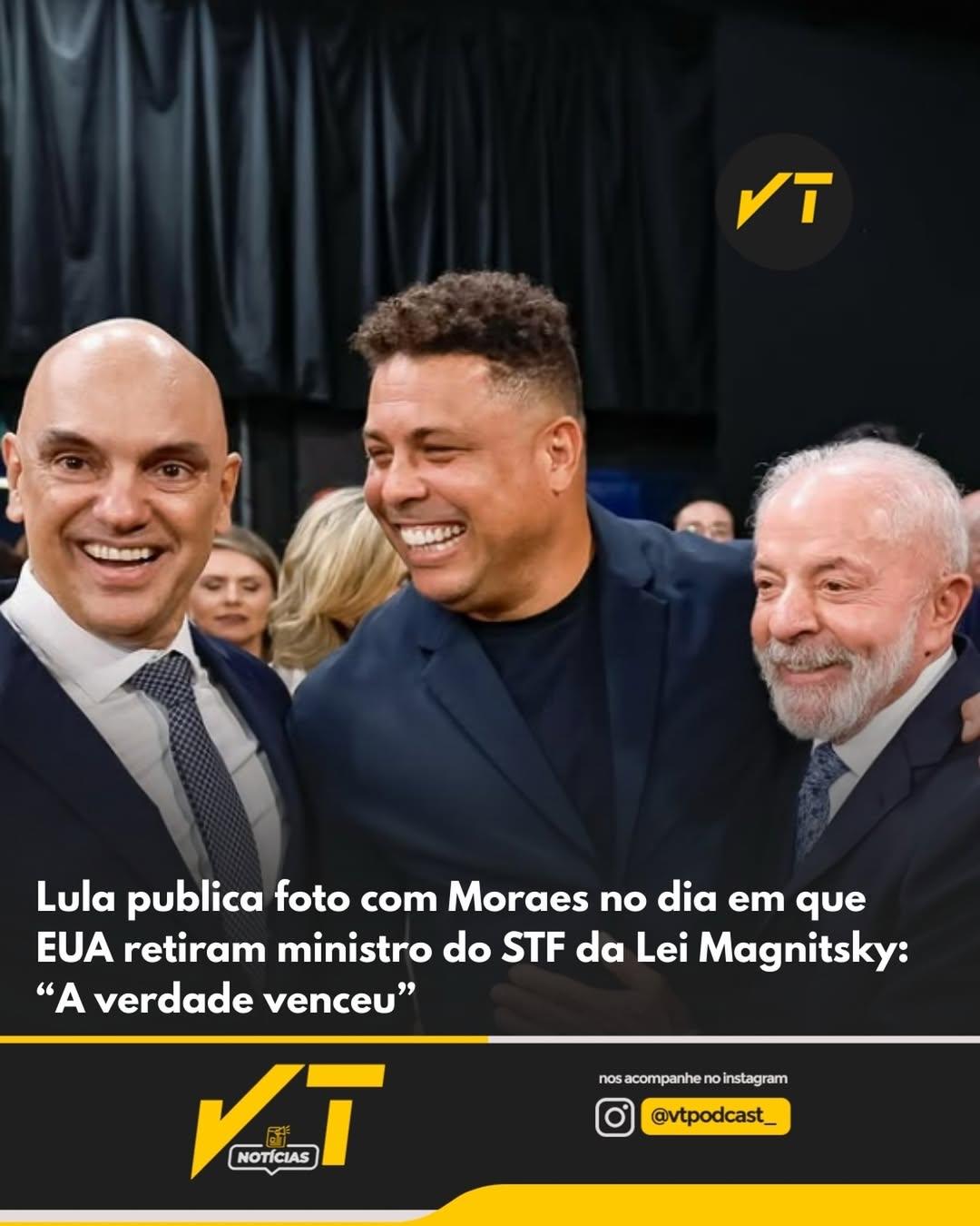 VT Notícias:O presidente Luiz Inácio Lula da Silva voltou a se manifestar publicamente ao lado do ministro do Supremo Tribunal Federal Alexandre de Moraes no mesmo dia em que o governo dos Estados Unidos oficializou a retirada do magistrado da lista de sanções prevista na Lei Magnitsky. A publicação, feita nas redes sociais, trouxe uma imagem descontraída, com a presença do ex- jogador Ronaldo, e marcou simbolicamente o desfecho de um episódio diplomático que vinha gerando repercussão.
