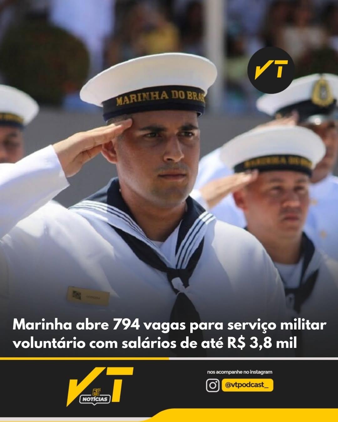 VT Notícias: A Marinha do Brasil deu início a um novo processo seletivo para reforçar seu quadro temporário, abrindo 794 oportunidades para quem deseja ingressar no Serviço Militar Voluntário. As vagas estão espalhadas por todas as regiões do país, contemplando os nove Distritos Navais, com remuneração que pode chegar a R$ 3.835.