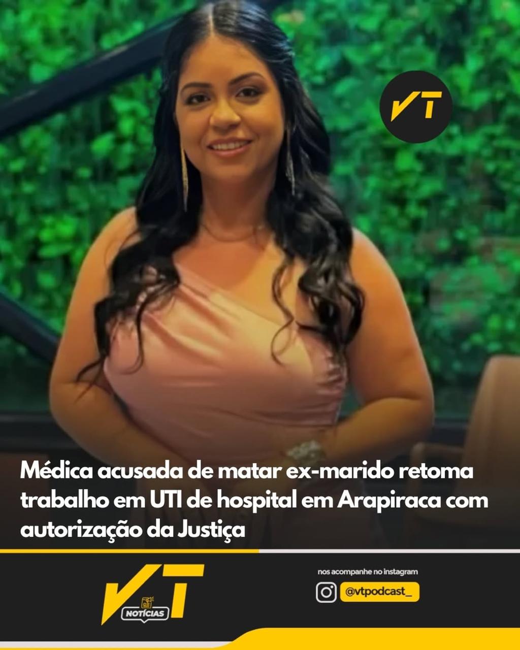 VT Notícias: A médica Nádia Tamyres Silva Lima voltou a exercer suas funções na Unidade de Terapia Intensiva do Hospital de Emergência do Agreste, em Arapiraca, após autorização do Poder Judiciário. Ela responde em liberdade pelo homicídio do ex-marido, o também médico Alan Carlos de Lima, morto a tiros, e aguarda o desfecho do processo criminal.
