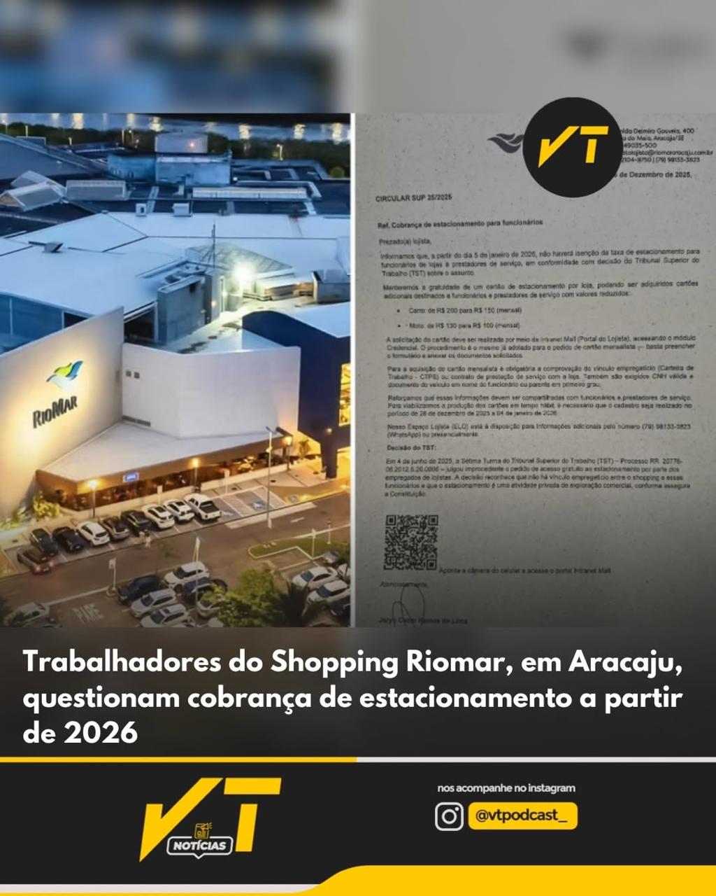 VT Notícias: A decisão de implantar cobrança de estacionamento para quem trabalha diariamente no Shopping Riomar Aracaju provocou reação imediata entre funcionários de lojas e equipes terceirizadas. A mudança, comunicada internamente, prevê o fim de qualquer tipo de isenção a partir de janeiro de 2026, alcançando todos os trabalhadores que utilizam o espaço para exercer suas funções.