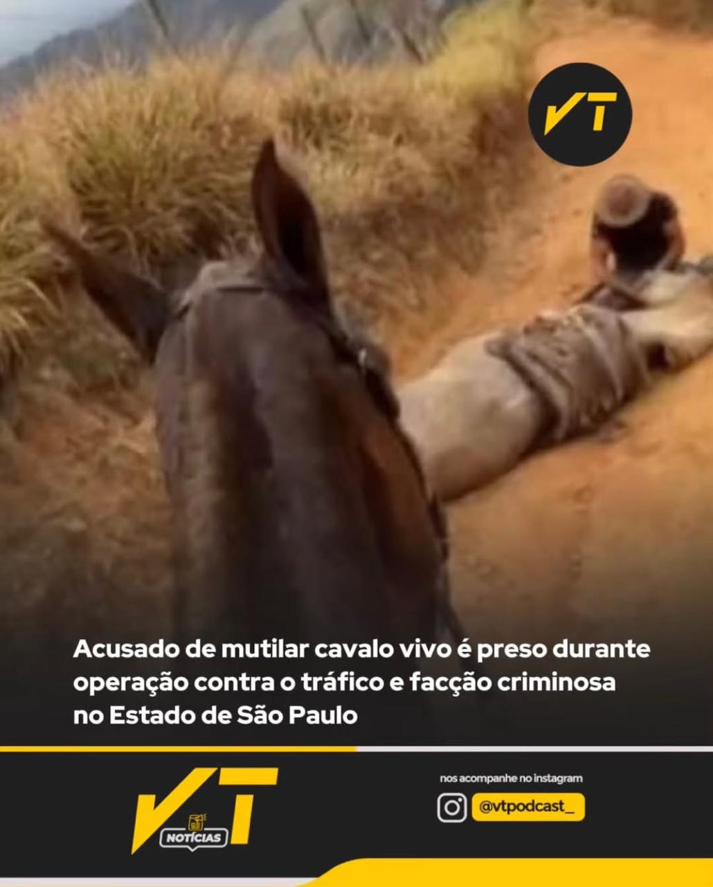 VT Notícias: Uma operação da Polícia Civil contra o tráfico de drogas resultou, neste sábado (10), na prisão de um homem investigado por mutilar as patas de um cavalo vivo em Bananal, no interior de São Paulo. Andrey Guilherme Nogueira de Queiroz, de 21 anos, foi detido em uma ação que mirava indivíduos com supostas ligações com a facção criminosa Comando Vermelho, durante a qual foram cumpridos 14 mandados de busca e apreensão e apreendidos 30 pinos de cocaína em uma das residências.