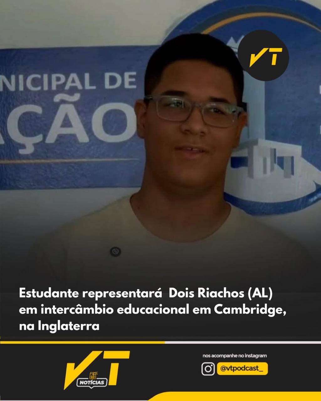 VT Notícias: O estudante Nathanael Vieira, do município de Dois Riachos, foi selecionado para representar a cidade em um intercâmbio educacional em Cambridge, na Inglaterra. A experiência internacional será marcada por aprendizado acadêmico, intercâmbio cultural e novas oportunidades de desenvolvimento pessoal.