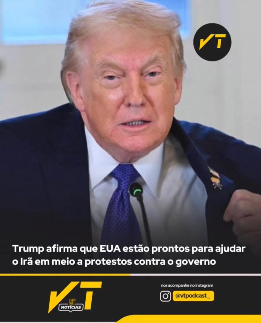 VT Notícias: O presidente dos Estados Unidos, Donald Trump, afirmou nesta sexta-feira (9) que o país está pronto para ajudar o Irã diante da onda de manifestações populares que atingem diversas cidades iranianas. Os protestos, que começaram no fim de dezembro, têm sido reprimidos pelas autoridades locais e já deixaram dezenas de mortos, segundo agências internacionais.